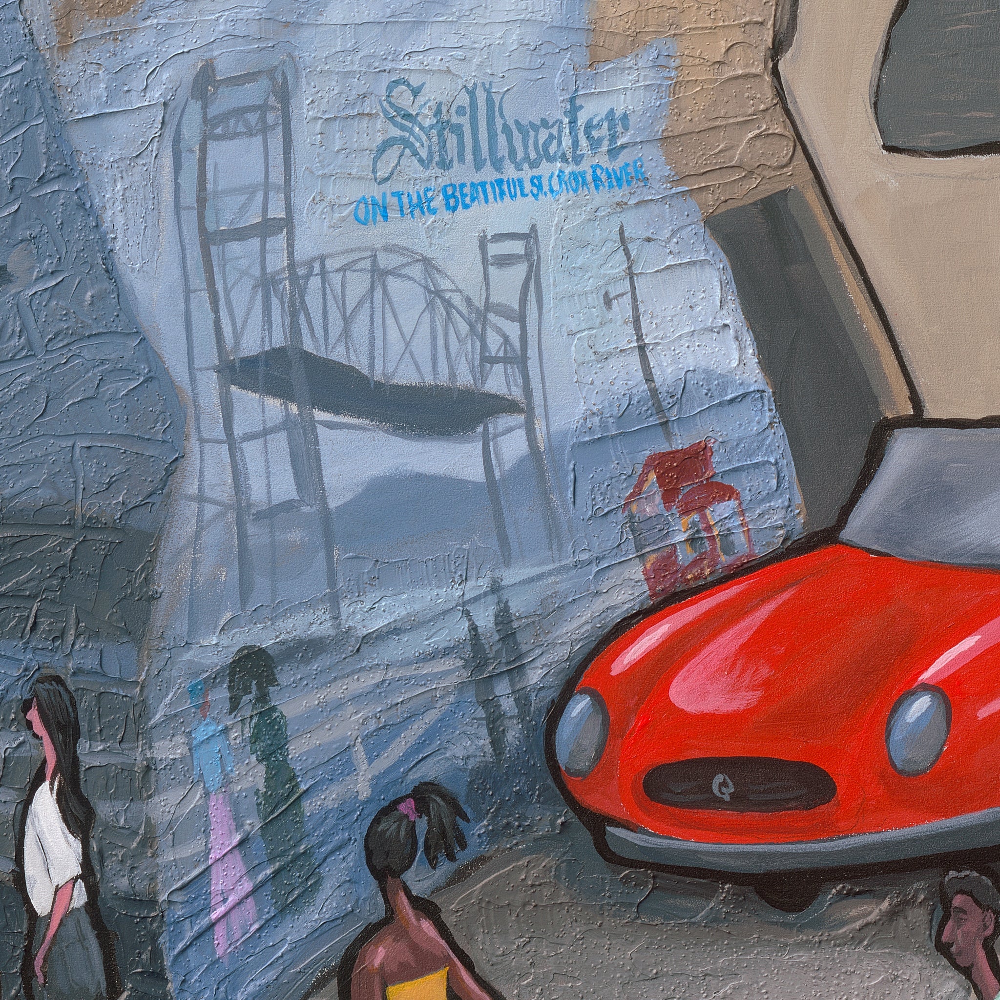 24" high x 30" wide. Acrylic on Wood. Framed in oak.